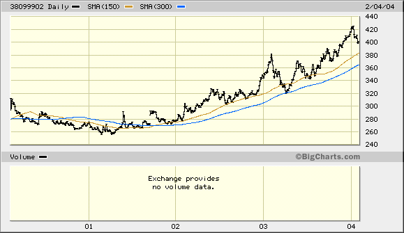 Which moving average came to gold's rescue last year when the 30-week MA failed? Why, the 60-week MA of course! Note the successful test and reversal off the rising 60-week MA in early 2003 in the chart below. This very important moving average currently intersects at about $367.