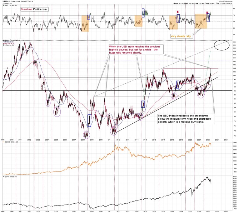 It doesn’t mean that the USD Index’s rally is likely to end there. It’s not – but the USDX could take a breather when it reaches 104. Then, after many investors think that the top has been reached as the USDX corrects, the big rally is likely to continue.