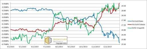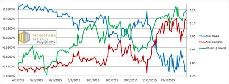 For each metal, we will look at a graph of the basis and cobasis overlaid with the price of the dollar in terms of the respective metal. It will make it easier to provide brief commentary. The dollar will be represented in green, the basis in blue and cobasis in red.