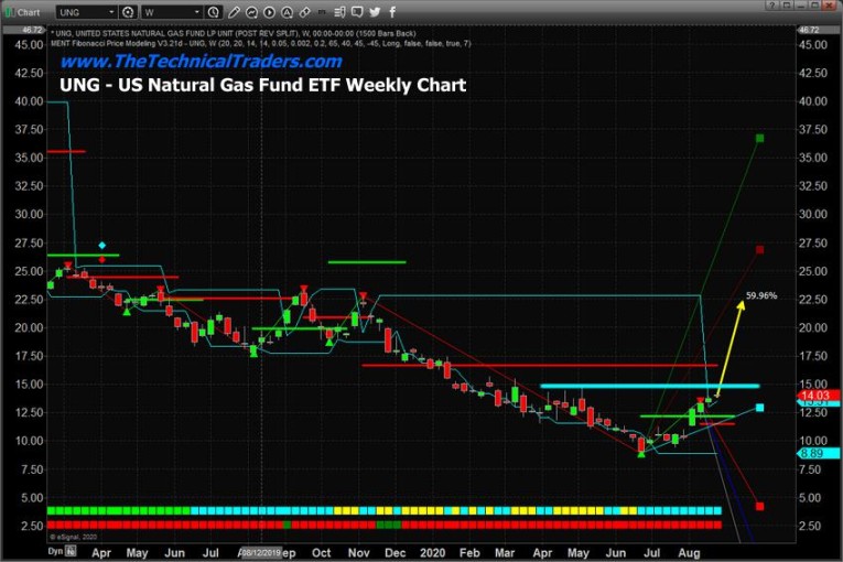This last breakout rally may represent a solid 35% to 55% upside price opportunity for skilled technical traders in UNG. When looking at the UNG chart, below, we believe that once UNG crosses the $15.00 price level it will quickly attempt to target the $20 to $22 level if NG rallies to levels near $3.00. It should also be noted UNG has not rallied at a similar percentage price level to NG during this bottom/rally. As such, a breakout move in NG could prompt UNG to rally 70% or more – possibly targeting $22 or higher.