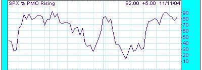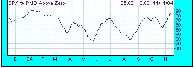 It shows an oscillator that naturally occurs as prices within the market ebb and flow. In short, it shows that as at November 11th 2004, 82% of Price Momentum Oscillators of the stocks that constitute the Standard and Poor Index were rising, but having bounced down from a peak of 90%. Yes, it is possible that the level could stay at around 80% - 90%, but history shows that the markets do not work in this way.