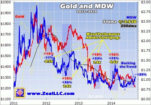 As you can see, MDW performed way better during gold’s next two uplegs in Q3 2012 and Q3 2013. Provocatively though it still underperformed its peers. While most junior elites leveraged gold’s 15% and 18% gains by at least 4.0x, MDW was only able to muster 2.4x and 1.8x positive leverage.