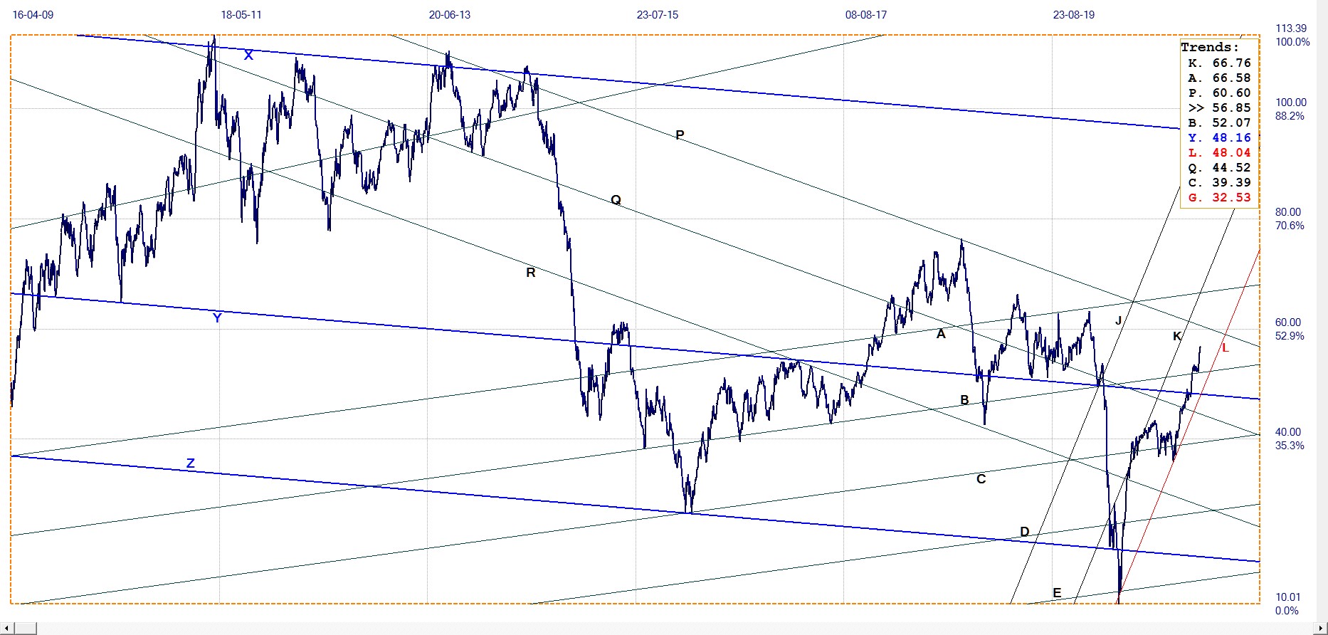 Before the price of crude broke higher above channel ZY, it held just below line Y while trying to affect the break. When the break happened, a steep move higher soon had the price breaking into channel BA, while holding well within the steeper bull channel KL. The price then clung to line B for three weeks before it resumed the rally last week, to close on Friday at a new intermediate high.