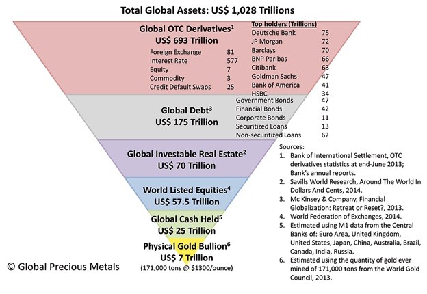 Our financial system can be visualized as an inverted pyramid with the asset classes of larger size (and risk) at the top. Most people are aware that gold is a scarce resource but are usually not aware of the sheer volume of other financial products which currently exist.