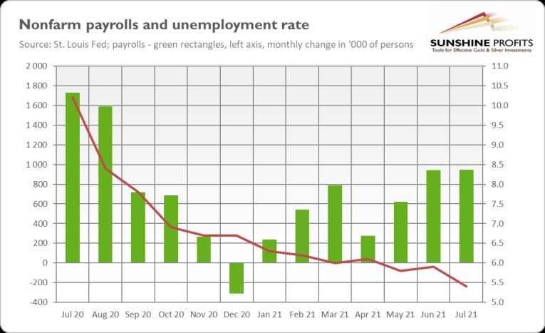 Another blow to gold! July’s nonfarm payrolls came in strong. As the chart below shows, the US labor market added 943,000 jobs last month, following 938,000 additions in June (after an upward revision). More than one-third of all gains occurred in leisure and hospitality, reflecting the economy’s reopening after the Great Lockdown.