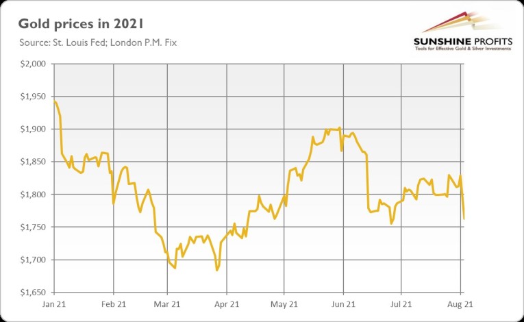 The tapering clock is ticking. In June, the Fed started talking about tapering, while last month it noted that some progress has been made towards its goals. It’s likely that within a few months mere progress will transform into substantial progress, especially given that the job gains in July were strong and above the forecasts. With further improvements in the labor market, the expectations of a more hawkish Fed should strengthen, exerting downward pressure on the gold prices.
