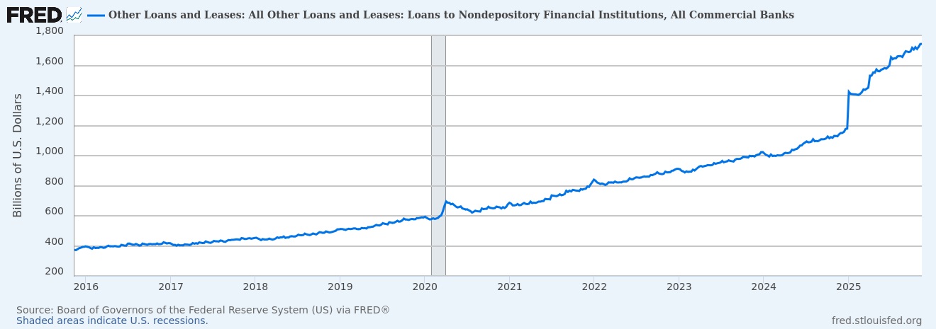The NDFI sector consists of a wide variety of non-bank lenders like subprime auto lenders, mortgage originators, payday lenders, equipment financing companies, commercial real estate bridge lenders, fintech lending platforms, and private credit firms. In essence, NDFIs can make the sorts of risky high interest loans that banks themselves aren’t allowed to make, but NDFIs themselves are considered creditworthy enough under current regulations for banks to lend to. Bank lending to NDFIs thus serves as the latest form of regulatory arbitrage, bypassing bureaucratic attempts to prevent bank exposures to the steadily deteriorating credit quality that always afflicts unconstrained bank credit expansions. Regulators never seem to learn that no mandated equity buffer is ever enough to avoid necessitating massive bailouts or timely central bank-engineered credit crunches.