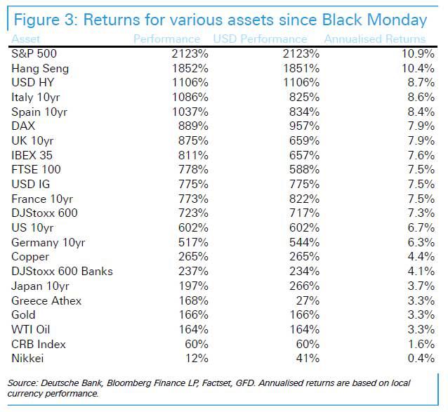 Even after the stock market crash and stocks becoming very undervalued, gold remains one of the top performing assets in the last 30 years, as demonstrated by the following Deutsche Bank table: