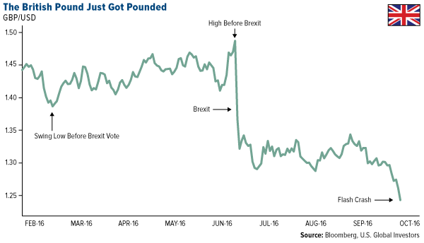 Like gold, the British pound took a hard beating last week, plunging more than 6 percent in early Asian trading to a three decade-low against the US dollar.