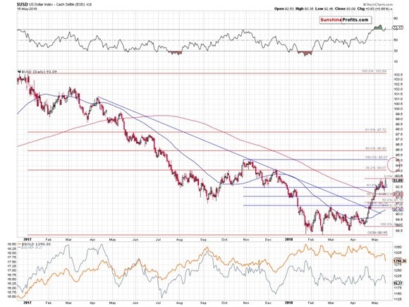 The situation in the USD Index was the only thing that had bullish implications for the PMs and based on what happened yesterday, the implications are now bearish. The USDX moved to new 2018 highs in terms of both: intraday and closing prices. This invalidates the previous theory according to which there will be another short-term downswing after a few days of pause. Based on the breakout, this is no longer likely. Instead, the USD is now likely to move to the next resistance or even higher (in fact, our short positions in EUR/USD are already profitable). The next two target prices are at about 94 and 95. The former is provided by the December 2017 top and the latter is based on the October / November top. The 94 level seems more important as its strengthened by the August and early October tops and the 38.2% Fibonacci retracement level.