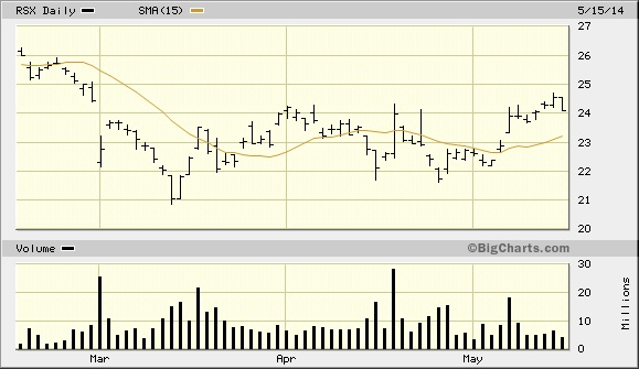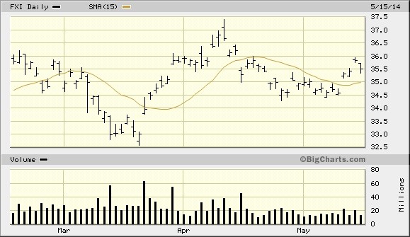 Another major factor which has underscored gold’s safe haven status in the past few months has been China. Specifically, investors rotated into gold earlier this year when it looked like China’s economy was headed toward a recession. Even now the economic data points to a soft Chinese domestic economy, with the China’s retail sales slipping to 11.9% in April compared with 12.2% in March. Analysts have pointed out that gold has gained 7.5% in 2014 due to safe-haven demand in the West, partly thanks to China. Yet even China’s stock market refuses to confirm the near-term weakness that analysts have forecast. The China Large Cap ETF (FXI), a good proxy for China’s stock market, has established a short-term low at the 34.50 level and is still well above its March low of 32.50. Unlike the economic statistics released by the government, FXI is forward-looking and seems to be reflecting a near-term scenario considerably less bearish than that of projected by the China bears. This represents one less safe-haven support for the gold price.