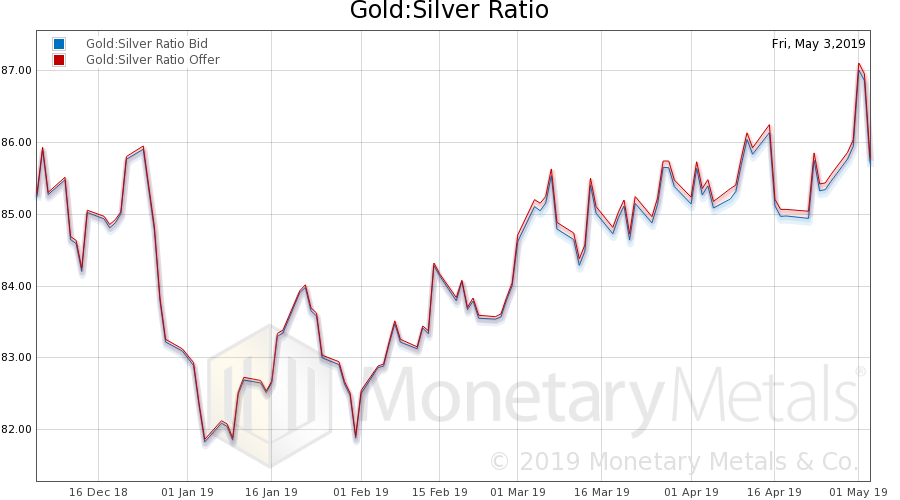 Next, this is a graph of the gold price measured in silver, otherwise known as the gold to silver ratio (see here for an explanation of bid and offer prices for the ratio). The ratio rose a bit (after spiking and coming back down).