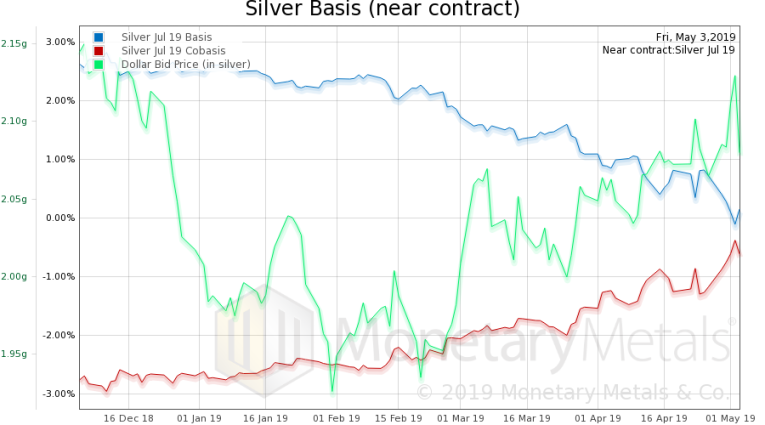 Here is the gold graph showing gold basis, cobasis and the price of the dollar in terms of gold price.