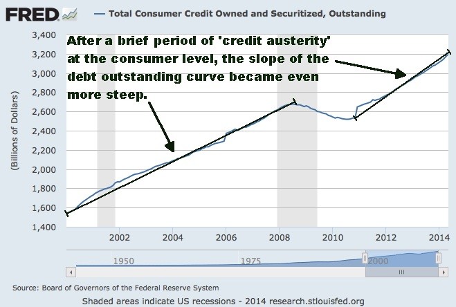Going into the great crash of 2008, consumer credit had been growing steadily, but its overall contribution to the economy over the 8-year period remained fairly constant in that while the overall debt load was increasing, the rate of acceleration (shape of the curve) was fairly constant. The function remained fairly linear over that period. Then we had a brief period of credit austerity from around the end of 2009 through the beginning of 2011 where the American people actually got a bit of responsibility and paid off some debt.