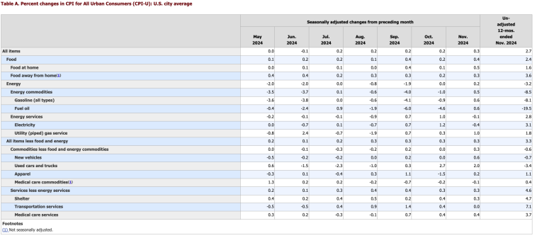 According to the latest Bureau of Labor Statistics data, prices rose 0.3 percent month-on-month in November. That nudged the headline annual CPI to 2.7 percent, up from 2.6 percent in October and 2.4 percent in September.