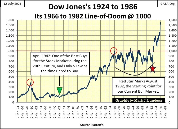 Much like precious metal investments today; in April 1942, only a few people more than ten miles away from the New York Stock Exchange, gave a damn about the Dow Jones.  Too bad, as April 1942 was the start of the second-best Dow Jones bull markets in history, that saw the Dow Jones rise to 1000 by 1966.  And what is the best bull market in Dow Jones history?  The one that started in August 1982 (Red Star above), a bull market that continues to this day.