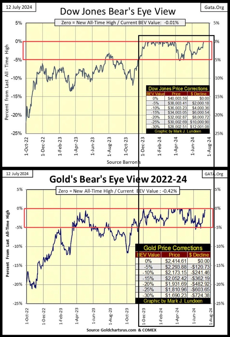For the past eight months, the Dow Jones and gold’s BEV charts have traded remarkably similar to each other; rising to scoring position, stayed there for a long time as they produced new all-time highs.  I’ve provided a Bear’s Eye View (BEV) chart for the Dow Jones and gold going back to October 2022 below.