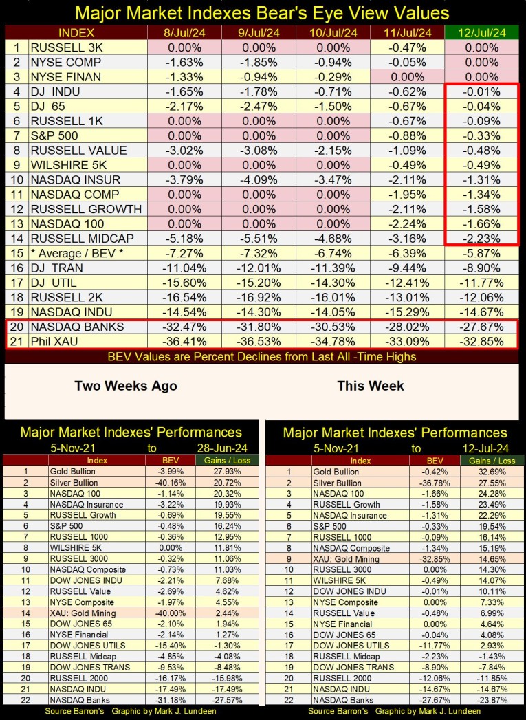 In July 2024, the public and managed money isn’t coming yet coming into precious-metal assets.  Looking at the same major stock market indexes seen above, but only at their BEV values (the market in terms of new all-time highs & percent claw-backs from those all-time highs) in the table below, this week saw many new all-time highs (BEV Zeros = 0.00%).