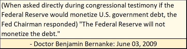 The truth be told, the Federal Reserve is no more truthful with Congress, though I suspect Congress expects to be lied to by officers of the Federal Reserve system, as this whopper of a lie from June 2009, as Bernanke’s QE1 was in progress (see chart above).