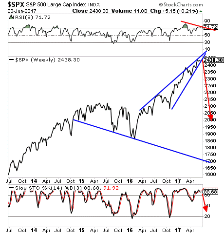 Now the big move is coming. The S&P 500 is completing a massive bearish rising wedge formation.