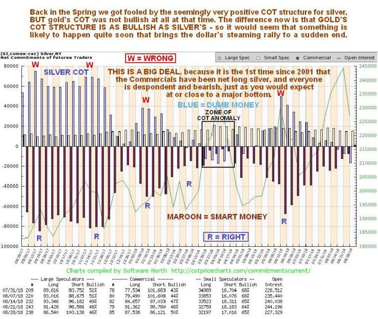 Fortunately, we can readily identify the sheepdogs and the sheep on our COT charts, the sheepdogs are the purple bars on our charts, the Commercials, who take the other side of the trade from the sheep, who are the blue bars, the Large Specs. Let’s now look at a pair of charts, a 1-year chart for silver itself with the COT chart stacked directly below it, which is for 1-year too, in order to see how the sheep are always wrong. As we can see the sheep, the Large Specs (blue bars) always have their biggest long positions at or just ahead of peaks in the silver price. This is not rocket science is it – to assist you in grasping this, an appropriate number of right and wrong labels have been added to the chart. While the obvious conclusion from this is that the Large Specs are just plain stupid, dumber than the dumbest jackass, as pragmatic speculators we do not waste our time condemning them, rather, we simply make sure that we are the opposite side of the trade from these clowns, and if they are going short silver to a significant degree, as they did last week, then we are going to make darn sure that we are long. If we are a little too early, and silver drops some more, then so what? The entire financial system is set to blow to smithereens before much longer, and the Emerging Markets collapse is just the start of it – the periphery is burning and the firestorm will soon spread towards the center. When that happens there are going to be “precious” few hiding places, and the Precious Metals sector will be one of the only boltholes around. Before leaving these charts it is also worth noting that the Commercials went long silver for the 1st time since 2001 last week and if that isn’t a sign of an imminent bullmarket, then I don’t know what is. Incidentally, with respect to the classic 1948 goldbugs film with Humphrey Bogart “Treasure of the Sierra Madre”, those of you who play casino slot machines may not realize that the refrain “Bonus? – we don’t need no stinking bonus!” that the “My Caramba” machine says in a thick Mexican accent when the bonus is cut short, is actually inspired by the Badges? – we don’t need no stinking badges! scene in the “Treasure of the Sierra Madre”, but I digress…