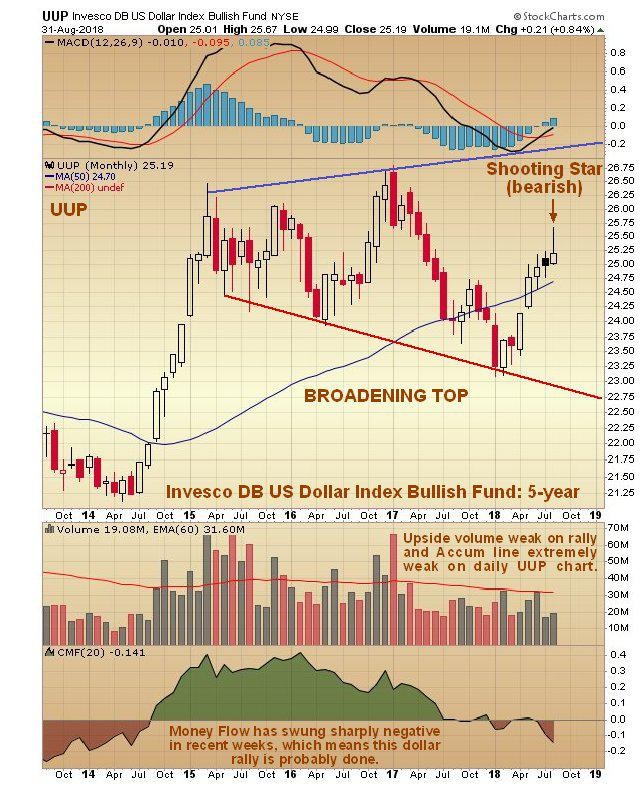 This monthly chart for dollar proxy UUP shows a bearish monthly “shooting star” for the month of August and money flow becoming negative in recent weeks, indicating that Smart Money have been taking profits in dollar trades. It also shows a big ugly potential Broadening Top. According to this chart the dollar is about to turn lower. It is also worth noting that the Accumulation chart for UUP on its daily chart has been extremely weak on this rally.