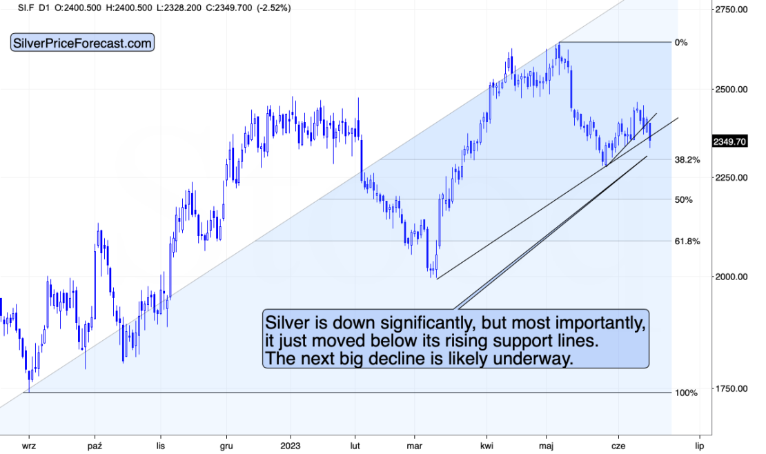Silver price is down significantly, but most importantly, it just moved below its rising support lines. The next big decline is likely underway.