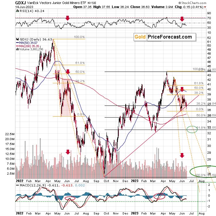 Even though it might not be clear on the above chart, the fact is that junior miners closed the day below their rising red support line. This is a breakdown that didn’t happen in May, so the situation is now more bearish than it was back then.