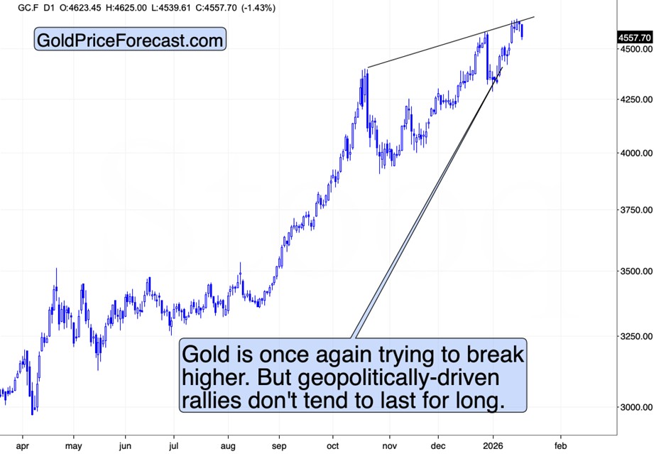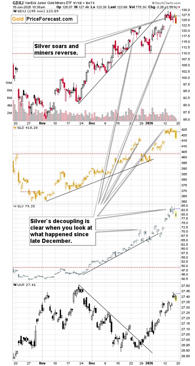 They all moved lower today, and GDXJ even (temporarily) moved down by over 2%. This is notable, but not yet groundbreaking. What is getting groundbreaking is gold’s performance and its invalidation of the move above $4,600.