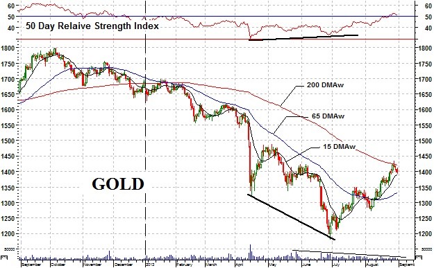 If you draw a trend line from the bottom of late June through the top in late August, and another trend line from that same bottom through the bottom in early August you get an expanding wedge within which one might expect the action to be trapped. There is also a strong support at the $1350 level so one would not need to panic from the intermediate term standpoint as long as the action remains above this support.