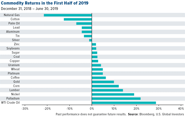 In a repeat of last year, crude oil was the top performing commodity, up 28.76 percent as of June 30. Price action was driven mostly by tensions in the Middle East as well as extended supply cuts by the Organization of Petroleum Exporting Countries (OPEC) and its allies. Global growth concerns began to put pressure on oil in April, but prices surged following June’s attack on two tankers near the Strait of Hormuz, for which the U.S. blamed Iran.