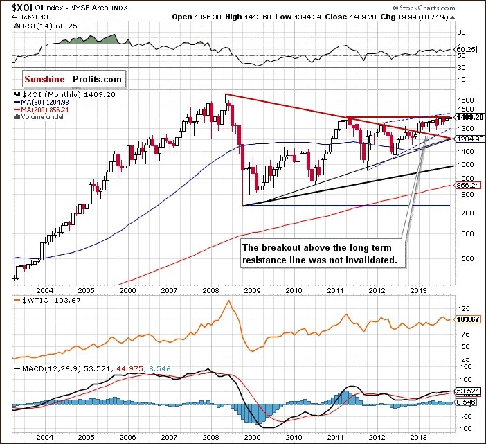 And what did happen with the oil stocks at the same time? They closed lower for a first time in five weeks. Does it mean that they become weaker in relation to crude oil? How does the relationship between light crude and the oil stocks look like? Before we try to answer these questions, let’s take a look at the NYSE Arca Oil Index (XOI) charts to find out what the current situation in the oil stock market is. Let’s start with a look at the monthly chart of light crude (charts courtesy by http://stockcharts.com).