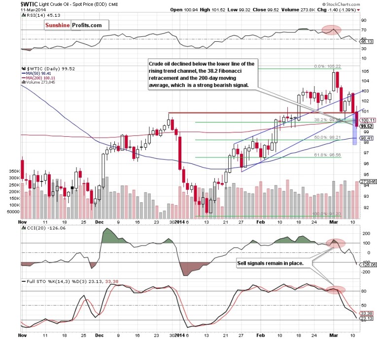 Looking at the above chart, we see that the buyers failed, which triggered a sharp decline yesterday. With this downswing, the CFD dropped below the 38.2% Fibonacci retracement and approached the lower target. As you see on the daily chart, yesterday’s drop also resulted in a decline below the 50-day moving average, which serves as resistance at the moment and successfully stopped buyers earlier today. This show of weakness encouraged oil bears to act and triggered a downward move, which took the CFD to the 200-day moving average. If this support line encourage buyers, we may see a corrective upswing later in the day. However if it is broken, we will likely see further deterioration. Please note that the nearest support (the 50% Fibonacci retracement) is slightly below the current level and may pause (or stop) the current correction. However, taking into account the fact that the indicators still support sellers, we may see a drop to $97.84 (the 100% Fibonacci projection based on the 2014 and March 7 highs and March 6 low) or even to the 61.8% Fibonacci retracement (around $96.55) in the coming day (or days).