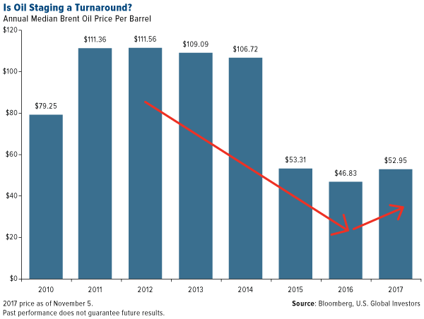 Mike McGlone, commodity strategist at Bloomberg Intelligence, points out that 2017 marks the first year since 2013 that the median price of WTI crude is higher than the previous year’s. (This is assuming WTI will trade range bound or higher between now and the end of 2017.)