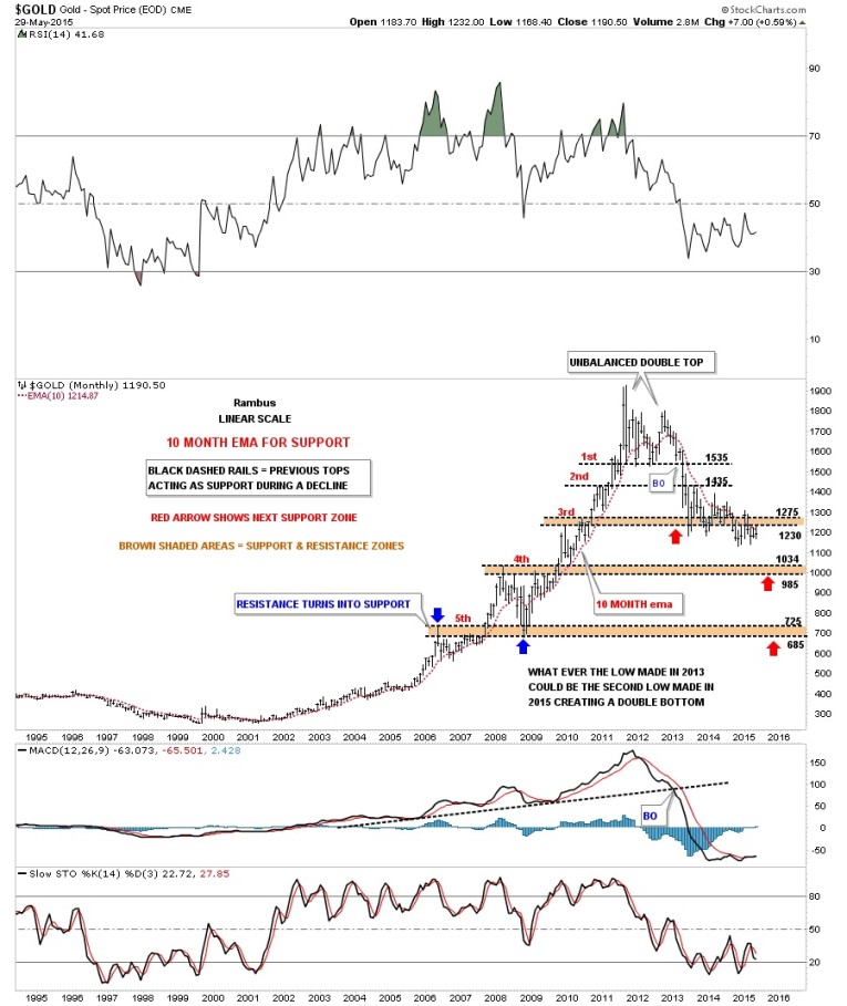 Next I would like to draw your attention to the 10 month ema which did an outstanding job of holding support during the bull market years. It has done a very good job also during the bear market that started in 2011. Since the high at 1535 over two years ago gold has only manage to close above the 10 month ema just twice by a small margin but then quickly reversed back down the next month. The high for this month, May, was 1232 which is the underside of the brown shaded S&R zone number three and the 10 month ema. The 10 month ema now comes in at 1215 which is about 25 points higher from the close on Friday which was the end of the month so that last bar is now history.