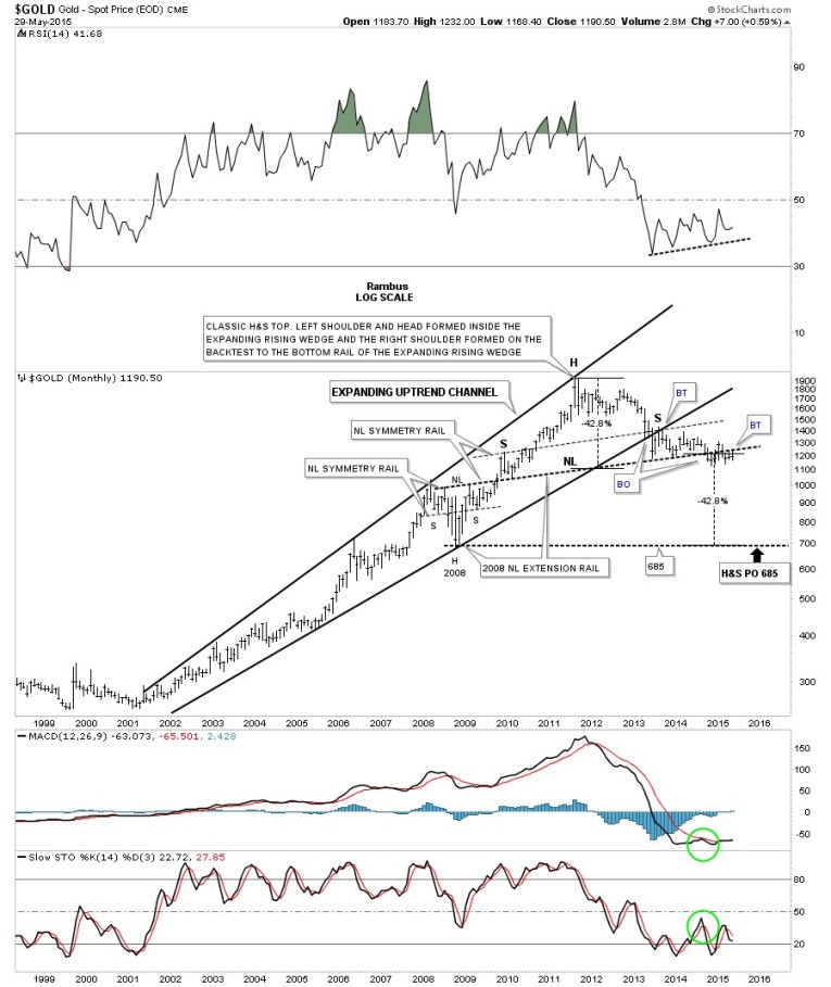 Below is another long term chart for gold I first built once the bottom rail of the expanding rising wedge broke down in 2013. There were several things back then that caught my attention. The first thing I was looking for was a back-test to the underside of the bottom rail of the expanding rising wedge which we got. Once that was completed I began to look at the possibility of a H&S top as I was pretty confident that the bull market was over at that time. As you can see, so far, gold has formed a classic H&S top which I’ve been showing you on some other charts where the left shoulder and head form inside the wedge or flag and the right shoulder forms on the back-test to the bottom rail of that wedge or flag. There is another big piece of the puzzle for why I think the H&S top is valid. Again some of our longer term members may remember when I extended the neckline from the H&S consolidation pattern that formed at the 2008 crash low, labeled neckline extension rail on the chart below. Outside of that little spike in January of this year above the big neckline the neckline extension rail is still functioning as resistance. There is one more piece of beautiful Chartology that I’ve been showing you on this chart and that is the neckline from the 2008 crash low also shows the lows for the left and right shoulders during the 2008 H&S consolidation pattern and the exact same angle shows the tops for the left and right shoulders on the massive H&S top. They’re labeled Neckline symmetry rails.