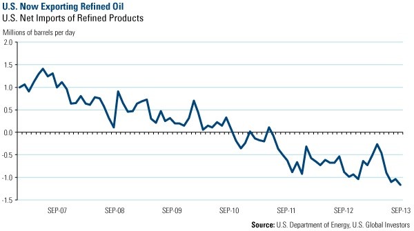 Refiners also benefit tremendously. Because crude oil exports are mostly prohibited, the oil is refined before being shipped to the rest of the world. As you can see in the chart, in recent years, the U.S. has moved from importing refined petroleum products prior to 2010 to exporting more than 1 million barrels per day as of September 2013.