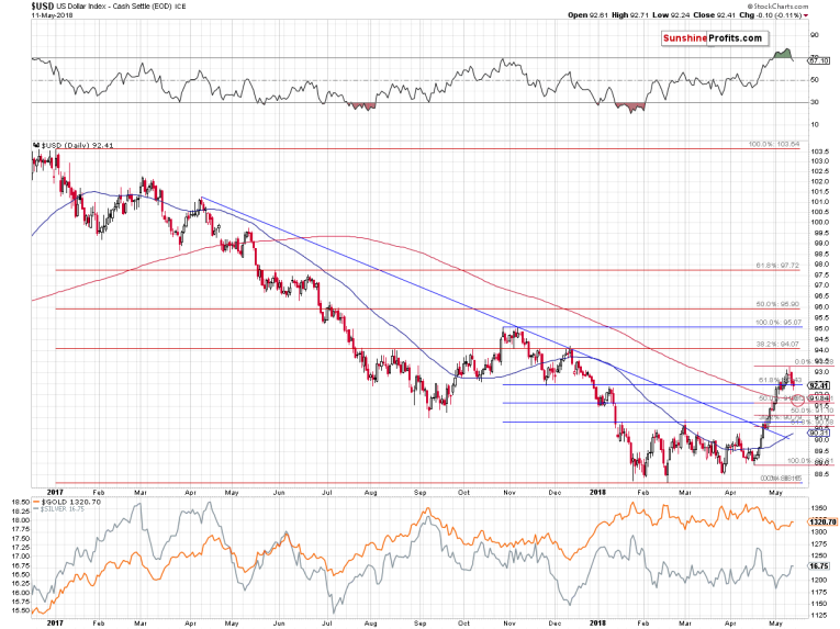 In 2014, the USD corrected to almost the 38.2% Fibonacci retracement, but only in terms of the intraday low. Therefore, if history is to repeat itself, the USD might move close to 91.6 in a sharp manner and then move back up. This would likely result in a sharp rally higher in PMs (especially in silver) and then a move back down before the end of the session.