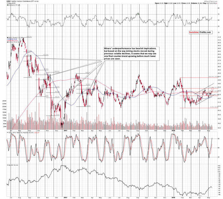 Second, GDX is very close to its strong short-term resistance. The resistance is provided by the mid-February and April highs and the 61.8% Fibonacci retracement.