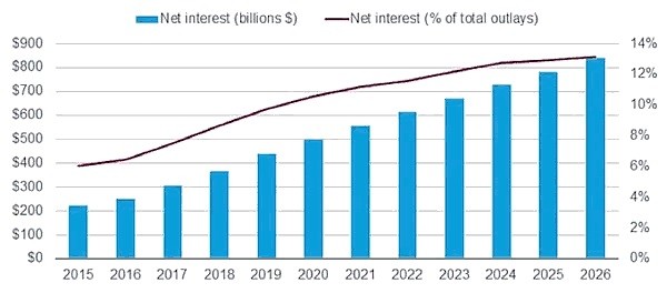 The Congressional Budget Office is showing that the interest on our current debt is about $250 billion for fiscal 2016. These annual interest payments will be growing to over $800 billion in less than 10 years. We are on an "unsustainable" path!
