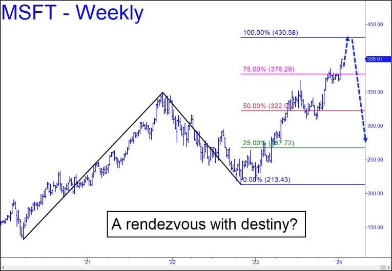 This grim picture, in contrarian fashion, appears to have triggered the ‘stupid’ factor into overdrive, sending stocks soaring on Friday as though the U.S. and global financial picture were just peachy. How long can this gusher of mass hysteria last? Once again, I turn to a chart of Microsoft shares for the answer. It still says the bellwether stock, currently trading for $397, is likely to hit $430 before the bull market ends. I first published the chart and target a few months ago, and nothing has changed. The rally went a little wobbly in December, but this gave bulls a chance to stage for a push that has tacked on a 6% gain in the last 10 days. That’s why I am sticking with a major top at 430, although we’ll need to be alert to a possible stall at 419, the ‘Hidden Pivot target of a lesser pattern. Going public with this target and drum-rolling it for months has probably queered its voodoo magic. But the ABCD pattern from which the target was extrapolated is sufficiently compelling to imply it is highly unlikely to be off by much. Caveat emptor!