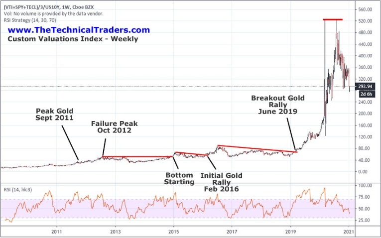 There is very little corresponding data to compare to – so we'll have to continue to try to dig deeper for any confirmation of this unique setup. Yet, we can't underestimate the DUAL PEAK setup on the Custom Index chart and the fact that the second peak, August 2020, also aligned perfectly with the current peak price in Gold. Since that August 2020 peak, both Gold and the Custom Index chart have continued to breakdown and trend lower. It makes sense that Gold will continue to move lower, in alignment with the Custom Index chart, attempting to find a new bottom/momentum base. We believe the 200 to 240 level on the Custom Valuations Index chart may be a suitable range for this new bottom.