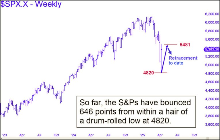 [Two weeks ago, I made the seemingly outrageous prediction that Trump’s tariff offensive would not cause a recession and that the stock market bear would soon be over. Shares were in a steep plunge at the time, and investors around the world seemed ready to hit the panic button that Sunday night. The S&Ps had last traded around 5300, but my technical runes said they would fall no lower than 4820, even with traders in the grip of fear. Lo, the SPX fell no lower than 4835 on Monday, then bounced a whopping 646 points. Although they’ve since given back some of the gains, they are still 447 points above the low and showing little inclination to test it. That could change, of course, and stocks could relapse with a vengeance. If so, it would likely put the U.S. and global economies on a path toward deep recession, or even a Second Great Depression. That is what I might have expected if the 4820 target hadn’t looked so promising as a support. We shall see. In the meantime, I’ll continue to run my original commentary (see below) until the stock market proves me wrong. It is either going to new highs by summer, or about to resume a historic crash. RA ]