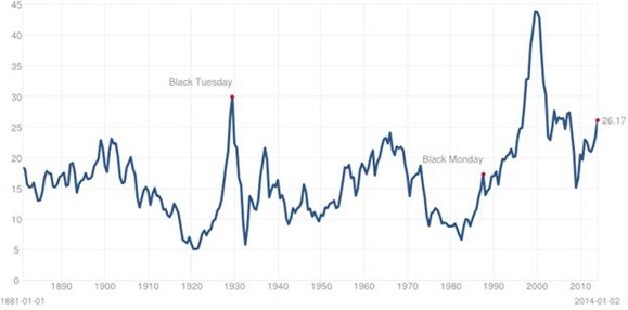 Currently market bulls will tell you that price to earnings ratios are well within their historic range. But they fail to mention that this statement is based on projected 2014 those earnings that won't be known exactly until 2015. More sophisticated investors tend to rely on the Shiller S&P 500 P/E Ratio which compares U.S. stock prices to average 10year inflation-adjusted earnings. This takes a lot of the guess work out of the equation. Today the Shiller S&P 500 PE Ratio is at 26.4. But going back 100+ years, the historic mean of the index is 16.5. This means the current ratio is 61% higher than its long term average.