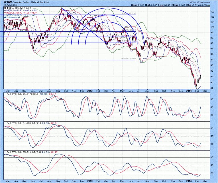The daily chart of the Canadian Dollar Index is shown below, with lower Bollinger bands beneath the current price, suggestive that a bottom was put in place. Full stochastics 1, 2 and 3 are shown below in order of descent, with the %K above the %D in all three instances. Extrapolation of the %K trend in stochastics 1 and 2 suggest at least another 2-3 weeks of further upside before a top is put in place. I will post the monthly chart of the Canadian Dollar Index next week, which suggests the upward trend could last into next year. The Canadian Dollar has been in a down trend for over 18 months, so a bounce is expected.