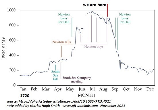 Some have claimed that Newton did not buy early in 1711, sell in April 1720 for a nice profit, then sink the majority of his substantial fortune in the bubble as it peaked in summer, and then suffering heavy losses as the bubble popped in September, but evidence supports this chain of events: Isaac Newton and the perils of the financial South Sea (Physics Today).
