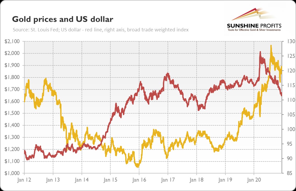 There is also an upward risk of higher inflation. In such a macroeconomic environment, the U.S. dollar should weaken against other currencies, thus supporting gold prices . As a reminder, the relative strength of the greenback in recent years (see the chart below) limited the gains in the precious metals market.