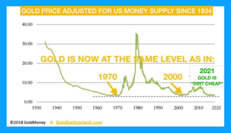 As the graph shows, gold is today at $1,800 as cheap, in relation to US money supply, as it was in 1971 when the gold price was $35 or in 2000 when the price was $290, and this is with so much paper gold in the market.