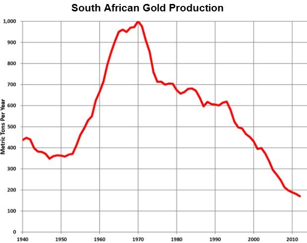 – SA gold production collapsed over 80% – from over 1,000 metric tonnes in 1970 to just 167.1 metric tonnes in 2016