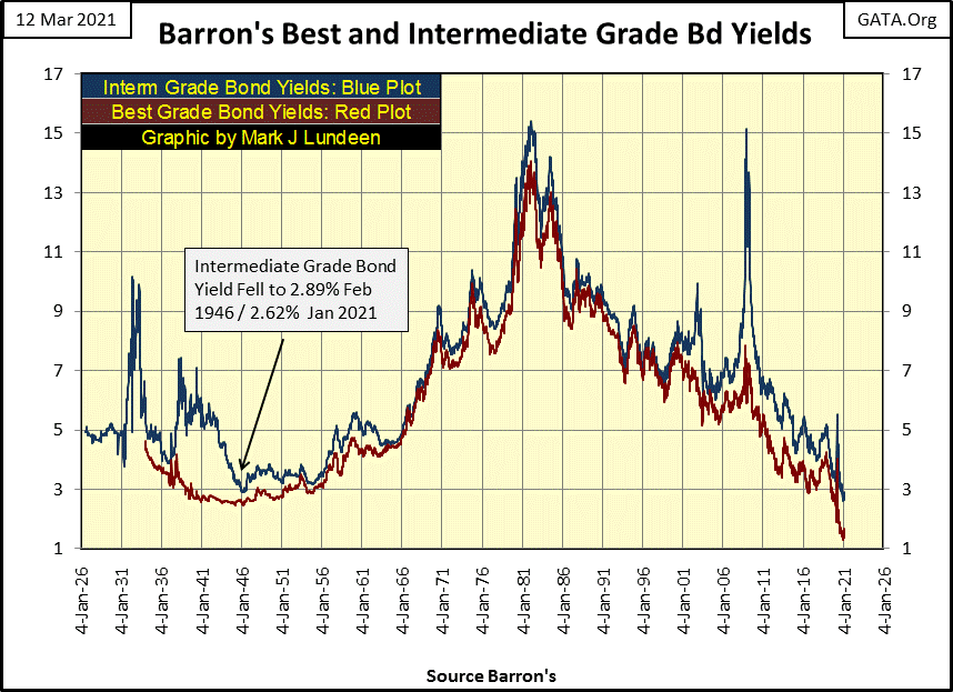 Take a look at Barron’s Intermediate Grade Bond Yields during the sub-prime mortgage crisis. They swiftly spiked from 7% to over 15% in less than a year. Then exactly last year in March, Barron’s Best and Intermediate Grade bond yields doubled in a week, forcing Fed Chairman Powell to begin purchasing corporate bonds to “stabilize” the debt markets.
